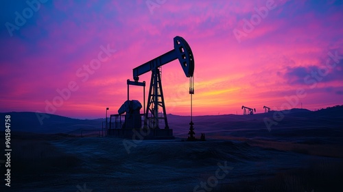 Silhouette of oil pump jacks at sunset in a vast landscape, ideal for illustrating topics in energy, petroleum industry, or environmental impact,