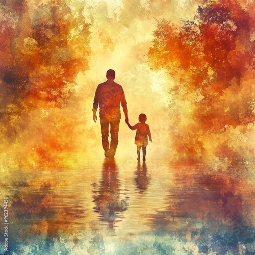Silhouette of Parent and Child Walking in Watercolor