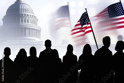 Silhouette of People Observing Inauguration with US Capitol and Flags Backdrop