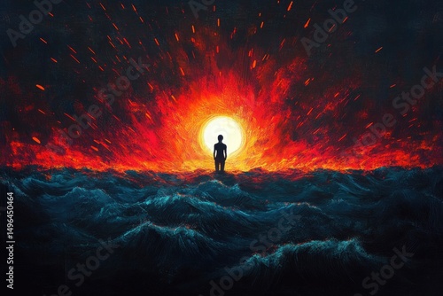 silhouette of person standing on turbulent ocean waves with a large glowing fiery sun and sparks in the background conveying dramatic and powerful emotion