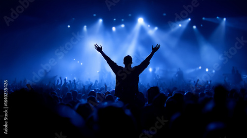 Silhouette of person with raised arms in crowd under blue stage lights, concept for music event promotion, festival advertising, and concert visuals