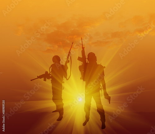 silhouette of Soldiers team with sunrise background