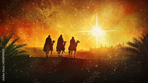 silhouette of the 3 wise men in the desert on their camels guided by a star