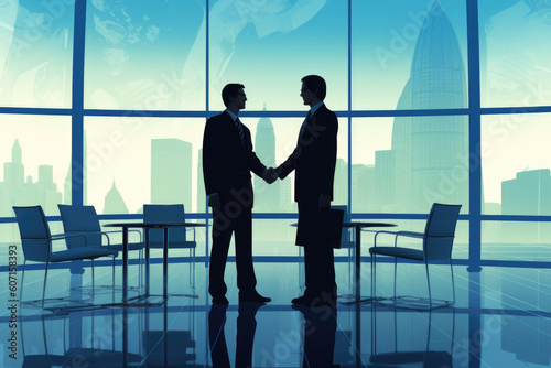 Silhouette of Two Businessmen Shake Hands Inside an Office Building - Generative AI