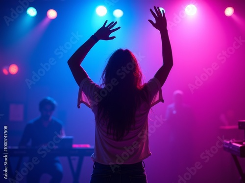 Silhouette of woman dancing in club with vibrant stage lights and live band in background