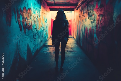Silhouette of Woman in Dark Graffiti Tunnel. Mystery, Urban Exploration Concept