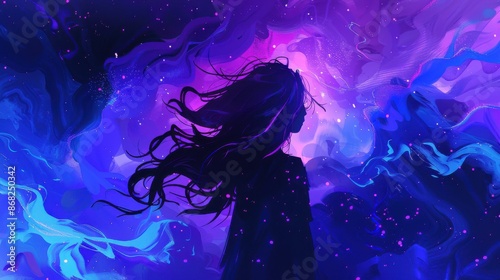 Silhouette of woman with long flowing hair against a vibrant, colorful cosmic background. Concept of dreams, fantasy, wonder, and the universe.