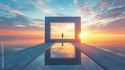 Silhouette person in a square frame at sunset.