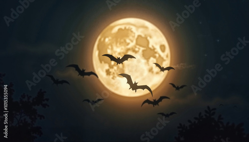 Silhouetted bats flying in front of a full moon at night for Halloween and spooky atmosphere