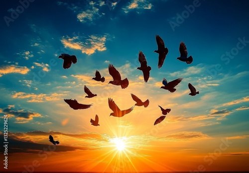Silhouetted Birds Flying Against a Bright Sunset Sky with Vibrant Colors and Dramatic Cloud Patterns
