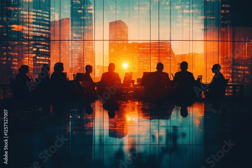 Silhouetted Business Team Meeting at Sunset Cityscape View