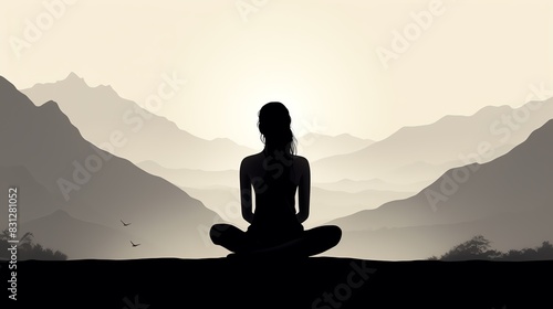 Silhouetted figure meditating outdoors in a serene mountain landscape at sunrise, promoting peace and tranquility.