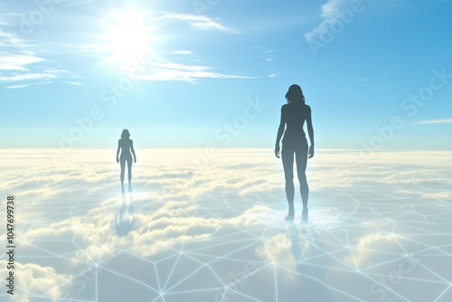 Silhouetted figures walk on futuristic cloudscape under bright sun