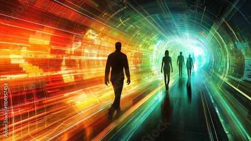 Silhouetted figures walk through a vibrant digital tunnel of light.