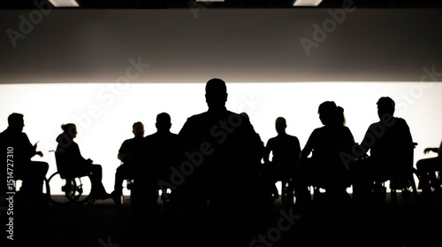 Silhouetted group in chairs, some wheelchairs, face bright wall