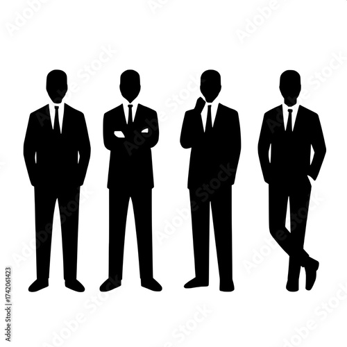 "Silhouetted male professionals in suits, aligned in a straight row, minimalist white backdrop, clean vector outlines."