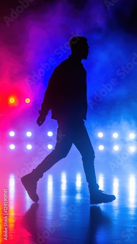 Silhouetted man walking, neon lights, smoky stage, concert background, music event