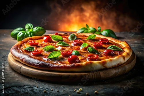 Silhouetted pizza, a meat lover's dream, basil and cheese, captured in dramatic nighttime photography.