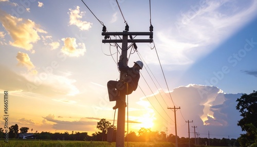 Silhouetted utility worker climbing power pole at sunset—wearing helmet and harness, surrounded by wires against glowing sky, symbolizing essential labor, risk, and energy infrastructure.