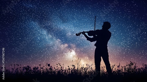Silhouetted Violinist Performing Beneath a Starry Night Sky in a Rural Landscape