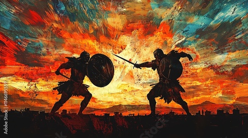 Silhouetted warriors engaged in an epic sword fight at sunrise against a fiery sky. Perfect for themes of conflict, heroism, and dramatic fantasy illustration.