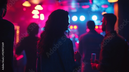 Silhouetted woman at a nightclub, neon lights, party.