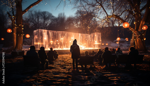 Silhouettes celebrate winter dusk, outdoors, illuminated by lighting equipment generated by AI