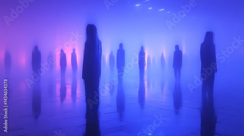 Silhouettes in a Foggy Colorful Atmosphere with Reflections on the Floor