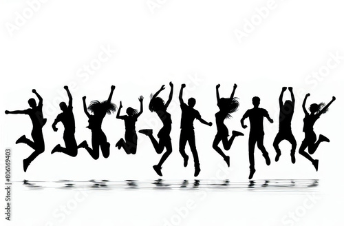 Silhouettes of a team of young people jumping together. Black and white