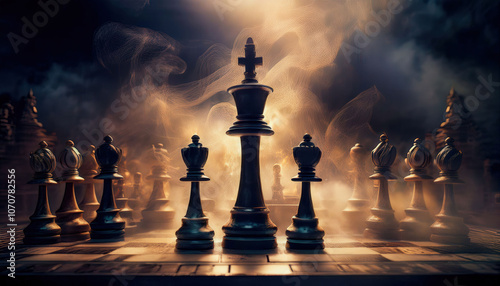 Silhouettes of chess pieces surrounded by curling smoke, evoking an atmosphere of strategy and contemplation. The smoke adds a sense of mystery, enhancing the intellectual challenge and tension