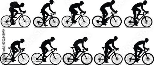 Silhouettes of Cyclists Riding Bicycles in Different Poses – Vector Illustration Showing Men on Road Bikes in Motion Side Views