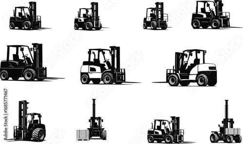 Silhouettes of Forklift Trucks and Industrial Lift Equipment – Heavy Duty Warehouse Vehicles and Material Handling Machinery Vector Set