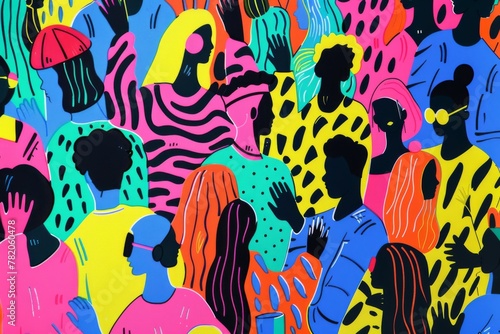 Silhouettes of people dancing at a party in bright costumes. Rave festival illustration in hand drawn style