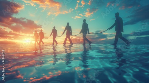 Silhouettes of people holding hands, walking on water at sunset with reflection in the ocean, creating a serene and harmonious atmosphere.