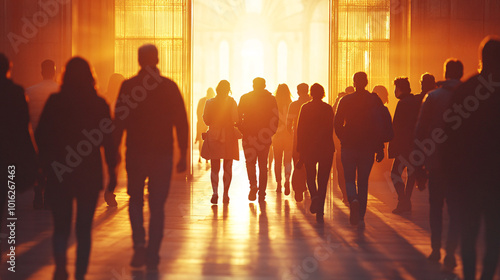 Silhouettes of People Walking Towards Bright Light Through a Doorway