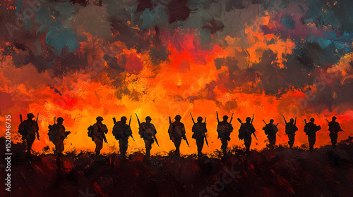 SILHOUETTES OF SOLDIERS WALKING UNDER DRAMATIC SUNSET SKY