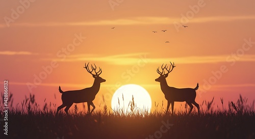 Silhouettes of Two Deer Standing in Grass During a Vibrant Sunset with Warm Orange Hues in the Sky