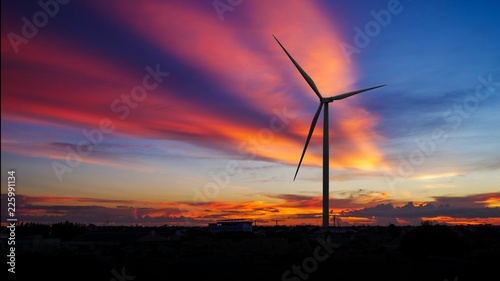 Silhouettes Wind turbine power generators at sunset, Alternative renewable energy production, Large wind turbine for electric
