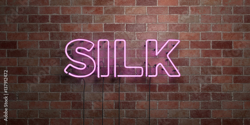 SILK - fluorescent Neon tube Sign on brickwork - Front view - 3D rendered royalty free stock picture. Can be used for online banner ads and direct mailers..