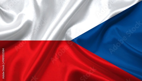 Silky red, white, and blue flag with triangular shape, draped in folds and waves, creating a dynamic texture