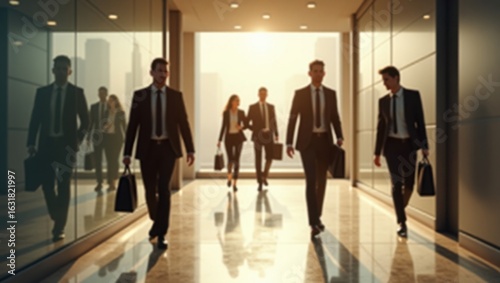 Siluetas tenues de trabajadores de oficina moviéndose por el pasillo con luz natural que entra a raudales, transmitiendo propósito y tranquila determinación
