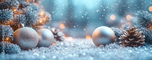 Silver Christmas ornaments nestled in snowy pine branches with warm lights.