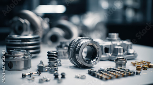 Silver Chrome Car Engine Parts, Blurred Background, Workshop Table, Ultra-Realistic Detail
