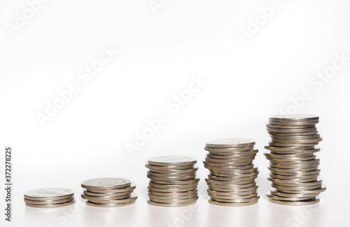 silver coin stack growth up isolated on white background with clipping path. money saving, financial grow, business startup, economy budget and investment concept.
