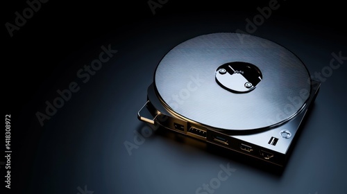 Silver, metal external hard drive on dark surface, minimalist design.