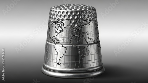 Silver Thimble with World Map Engraving, a Detailed Close-Up.