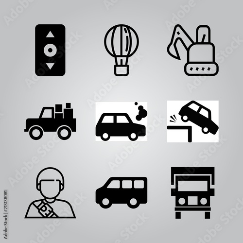Simple 9 icon set of transport related minibus, engine problems, hot air balloon and elevator vector icons. Collection Illustration