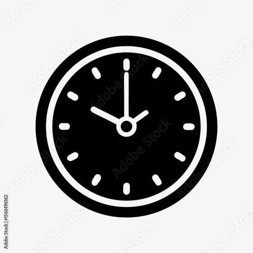 Simple black and white wall clock icon showing time, minimalist round clock symbol, flat design vector illustration