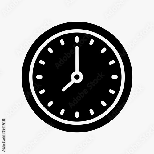 Simple black and white wall clock icon showing time, minimalist round clock symbol, flat design vector illustration