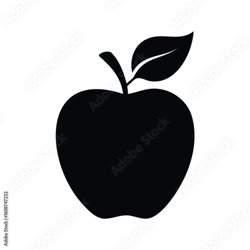 Simple Black Apple Silhouette with a Single Leaf on a White Background